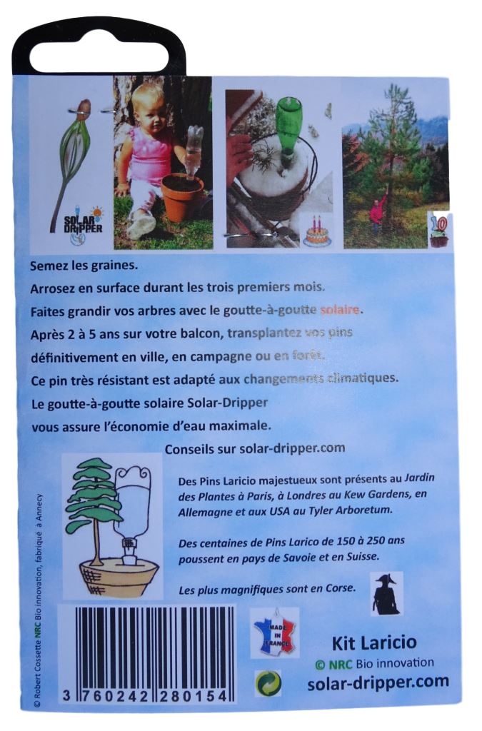 Le kit Laricio est un moyen facile de s’initier à la plantation de vos premiers arbres. Vous pourrez ensuite essayer avec d’autres variétés d’arbres pour enrichir la biodiversité. Le goutte-à-goutte solaire vous aidera à cultiver vos arbres et à les bouturer.