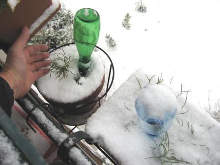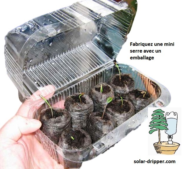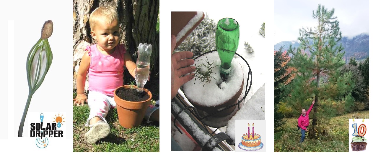 Après la germination, mettez vos pins dans un pot individuel d’environ 25 cm de diamètre avec le goutte-à-goutte solaire et une bouteille de 500 ml ou regroupez 6 pins dans un pot collectif de 30 à 40 cm de diamètre autour d’une bouteille de 1 litre.